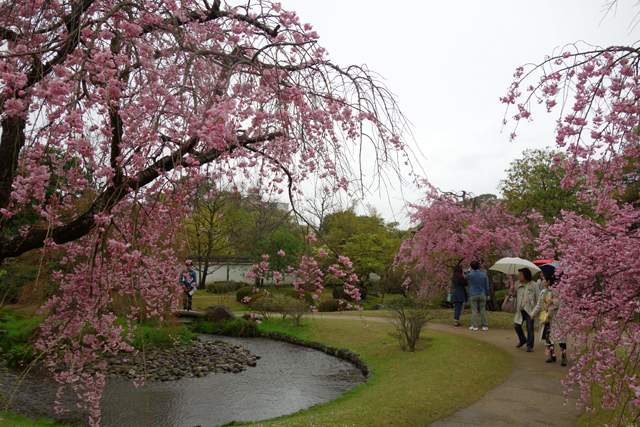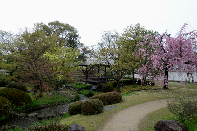 逛完了北院,我轉入南區的「流水平庭」,顧名思義地,此庭以曲繞流水串綴,能見石燈籠伴著矮岩散點成景。樸褐「流翠亭」於一方巧立,而由簷下望出的,是枝垂櫻的粉柔嬌態,其垂墜於枝梢的櫻朵豐盈,輕悄地任雨露亮澤、隨徐風飄逸。如此環望著,突然我又念起「姬路城」的花雪連綿了,畢竟那揉雜冬之色與春之妍的幻美讓人無法忘懷,彷似一場烙印至骨的深戀,即便事過境遷,但轉首間片爪殘鱗的偶然瞥現,依舊勾起難以遏抑的悸動。
