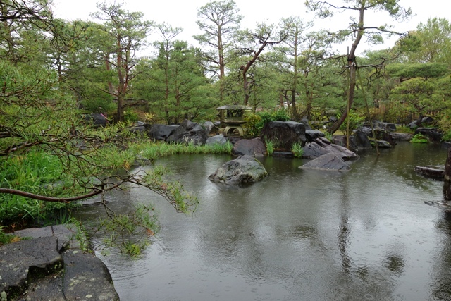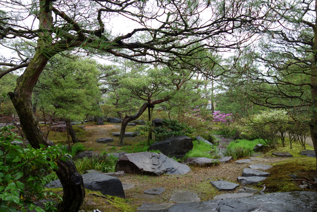 續往前,景色又悄然更迭,由「松之庭」替上群松的卓然身姿。在川池拐繞的院落裡,蒼枝無視四季的更迭,或似矍鑠老者拄杖傲立,或如颯爽漢子擎矛穿雲。縱使綿雨漸疾,擊亂了池間水色,也陰鬱不了倒映的園裡清朗。