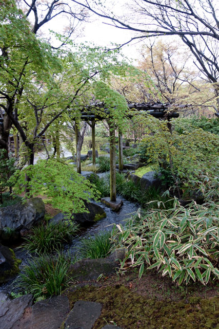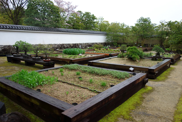 踏著橋石,望著靜池映翠,曲徑在遊轉中引我走入隔鄰的「苗之庭」。此庭看來是各樣植栽的培育地,木架縱橫圈出園圃,當中簇生著秀碧葉芽,儘管簡略日文字牌與我隔閡,難以勾勒壯生後的姿態,但倒不由自主期待起這些棚下盆間的生命,祈願它們在移入主園後,也能綻出屬於自己的獨特風華。