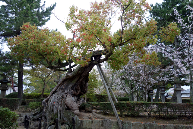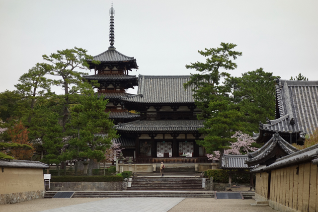 往復望看過後,便算是將「法隆寺」走訪一遭了,雖因時間有限,未能多所駐留、細細品味,但終究是了結數年來的心願,見識過這所謂的最古木造建築群。我看著櫻華,走過花毯,行經扭折奇樹,在返途的最終,再次回望著「西院伽藍」,與那峻偉的樓塔說聲再會。