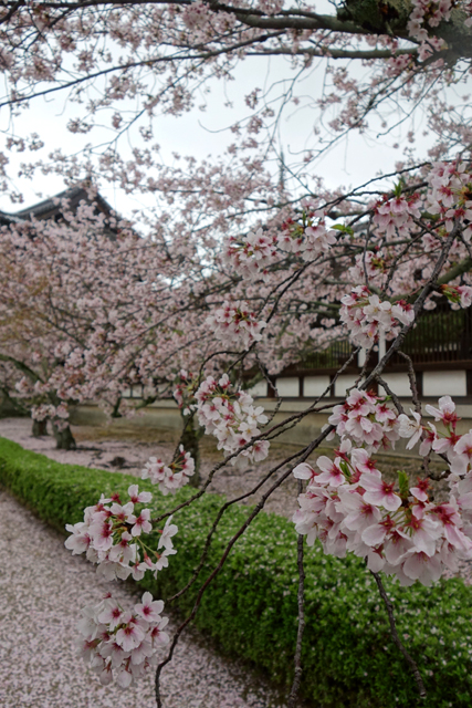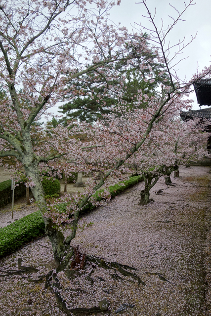 由「大寶藏院」步出,我繼續往東朝寺裡最末一區而行。然儘管時間緊迫,途中卻不時被落櫻散抹的景畫勾停腳步。畢竟從「綱封藏」開始,原本灰褐的砂地便被綴點成柔粉,當行上通抵「東大門」的筆直參道,石板路兩側更是宛若覆雪,就像冬末的霜寒雖過了季節仍不捨離去,在飛降間被春陽染上艷色,於是落在枝梢、附於草泥,成了整路無盡的絢麗。