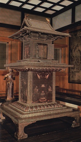 但閉鎖的廳室不僅於此,北側並陳的「繪殿」與「舍利殿」亦然,前者據稱收納繪有「聖德太子」生平事蹟的障壁畫,後者顧名思義自是舍利的珍藏之所了。不過舍利的來由頗為奇幻,說是「聖德太子」兩歲誦唸佛號時,由掌中所生落。雖這典故頗帶傳奇色彩,但對信眾而言,卻是充滿神性的太子遺身物,至今還保有所謂的「舍利講」儀式,在特定節日會將舍利啟封、誦經、再敬收。