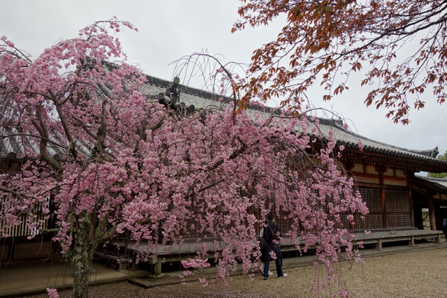 訪過了「法隆寺」的「西院伽藍」,旁側還有兩個區域也頗值得賞望。沿著寺徑東行,這兒的林間植櫻繁密,櫻瓣半褪的枝頭露出艷紅花梗,讓它雖進了暮時,卻仍展現另種醺麗風韻。而落瓣細碎密布,疊覆於草葉、遮掩了浮根,彷若原本便是於地開綻的星渺粉花,歡語著季節的初始。