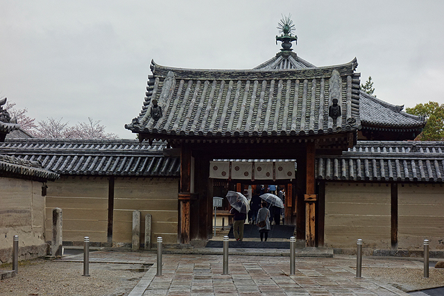 須臾,我望見一棟南北縱長的架高屋閣,其簷線挑揚、環廊繞圍、山牆下「向拜」探伸,再看了看標示,是重建於「鎌倉時代」的「聖靈院」。它原本稱作「東室」,是僧侶居住用的禪房,隔壁與之平行、外觀更為狹長的,則是供隨從歇息的「妻室」。「平安時代」末期「東室」南端改建為供奉「聖德太子」靈位的堂殿,現刻行經,入內敬祭的信眾也絡繹不絕。然我沒有時間本錢分心一探,只能壓抑著好奇,快步續行。