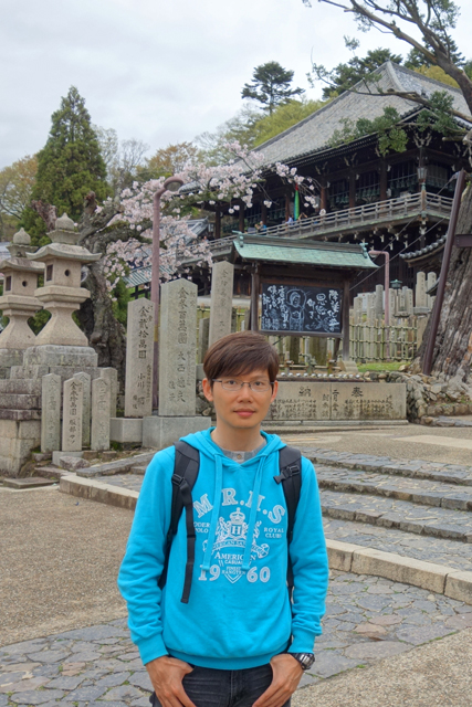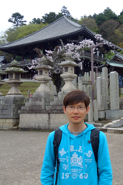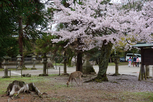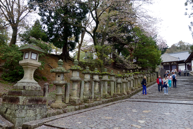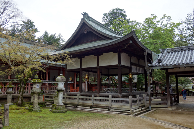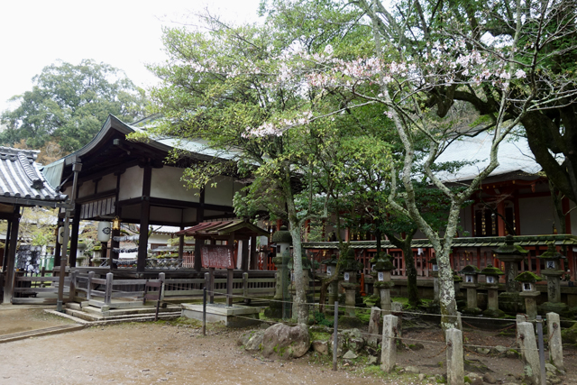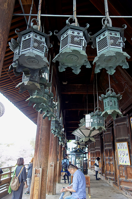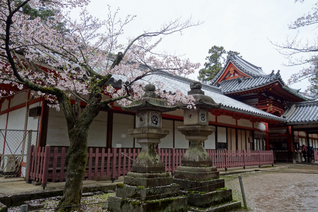 俯瞰著遼遠寺林,漫步在靜寂迴廊,有時在簷下停佇,怔望著流泉在石燈岩台跌墜,許久,我才踏階而下,離開了「二月堂」。日本神社通常都與寺院相依伴,這裡也不例外,與「三月堂」對望的便是座「八幡宮」,長廊與殿舍串接,難分主副。然其佈局究竟為何,此時也不重要了,畢竟苔染石燈籠互立、斑櫻碧樹拂掩牆簷便是幅美景,勾人心弦。