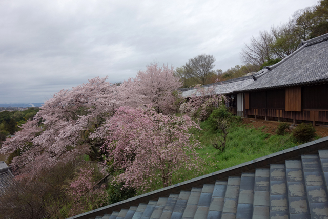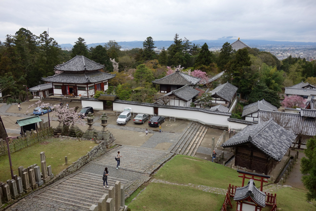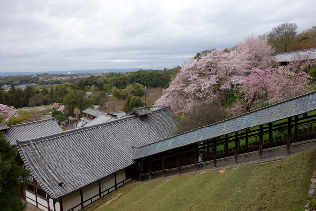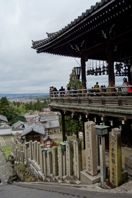 再將視線稍轉,另側的斜廊之外,有大片粉櫻在坡間碎點絢麗,它揉凝了天林之間的界線,也將被陰雲鬱抹的天色摻流些許歡悅。而更遠處難辨其形的屋舍,應就是奈良市區了,忍不住想,若將時空倒返千年,或許望見的便是古都曾經的繁華。