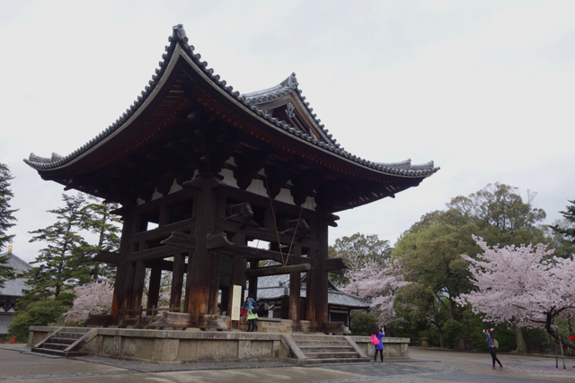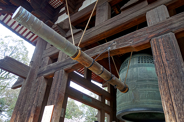 再往裡走,便能看到其實比「大佛殿」還要古遠的「鐘樓」。它與「南大門」一樣,皆為「鎌倉時代」的復建之物,柱椼呈現的質感相當拙重,其間的穿插榫接也不帶花巧,將樓體的炫揚留予脊簷的飛挑。跨步行近,我望著樑下懸鐘,銅綠色的它僅管沒有繁複刻紋,卻比樓身還彌足珍貴,因其歷史可追溯至「奈良時代」,承載了此院超越千年的榮枯興衰。