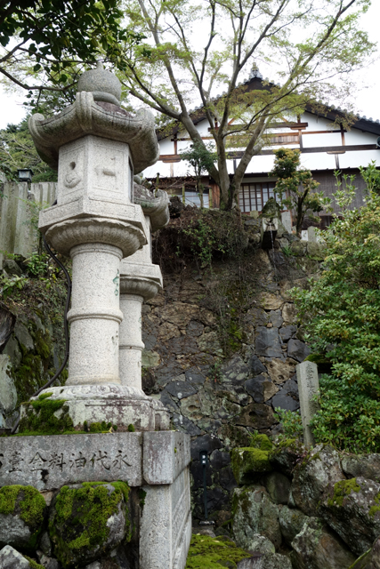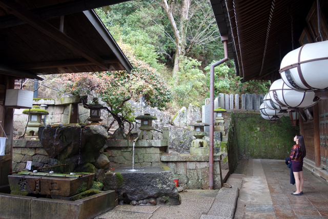 它是雙層結構,能見底樓齊列的斗栱前探出跳,支起上方正殿環廊,我一面望著檐線的挑揚,一面踏階而上。階邊拓出的小院很別致,石燈列柱密集成林,與錯岩植樹襯和一起便成靜幽庭園,而一線泉水從高閣涓細飛墜,擊出清冽音曲,看似毫不經意,又像縝密思考後的配置,很引人佇望。