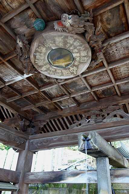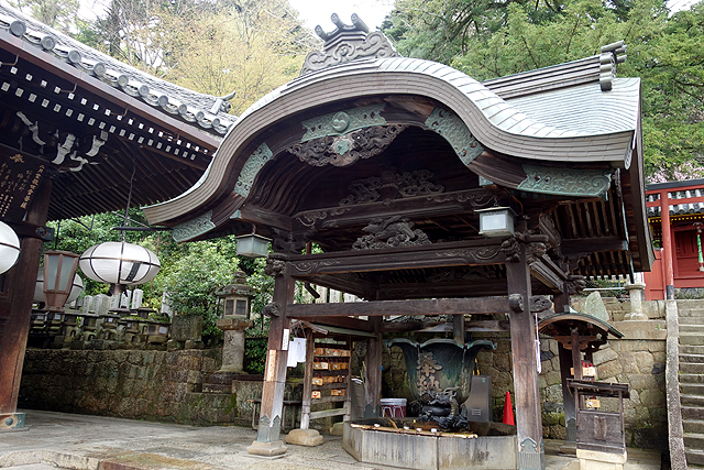 續往上,我來到二樓堂殿旁。這裡設了座以唐破風華麗勾顯的手水舍,簷邊椼架有雲紋鑲綴,簷口懸魚鏤雕細膩,亭內水泉則用瓣緣銅盆盛起、蟠龍護圍,是很少見的貴氣配置。這樣的費工或許跟此堂起源有關吧,它是「修二會」於農曆二月舉行「取水節」儀式的處所,因此與水的關係密切。