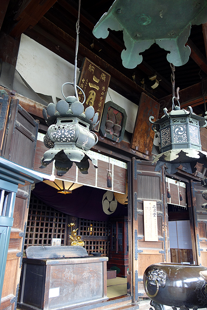 轉身望向殿側,這兒暗褐拉門接併,有銅綠紋片鑲飾,簷下掛展了許多已字跡斑剝的奉納牌額,顯得古樸。順著廊下懸綴的圓胖雪紙燈籠,我轉向堂殿正面,這兒列燈式樣一轉,幻作暗銅的六角翻葉風格,且越往中鏤雕越是華炫。行於其間,便像百花迎風艷展,搖曳生姿。