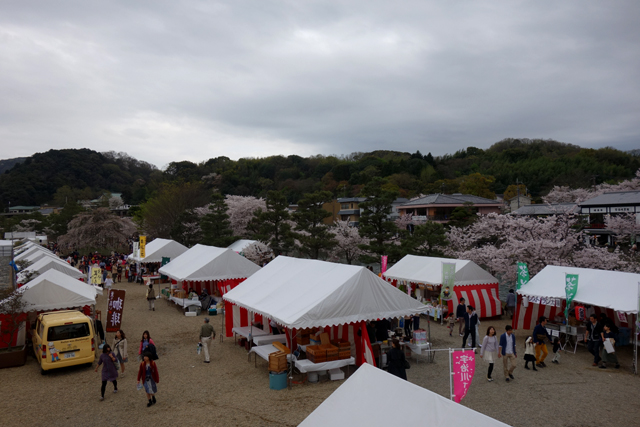 中島有點像座長型公園,特別是因著花季而人潮絡繹不絕,不少情侶乾脆在岸旁櫻下席地而坐,隨興啃著飯糰之類的簡便食物,閒望小舟載著遊客在川水舒緩悠蕩。島中也闢出一區設了許多攤位,賣著燒烤及特色茶點,不過感覺還是「平等院」表參道那兒的古樸商家比較引人,濃郁茶香襯著懷舊氣氛漫溢街頭,想來依舊迷醉。但這樣也好,至少不惹我分心,得以繼續飛快步伐,由另端步橋行抵對岸。