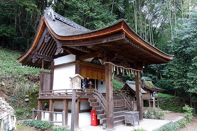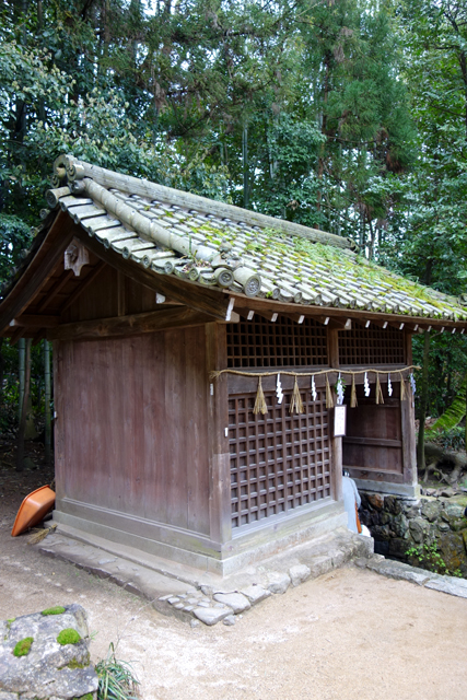 它有著檜皮葺頂,表面的斑剝突顯其年歲,而簷下樑柱雖亦褐暗,但仍隱透著舊時彩繪的殘遺,呈現引人的古色風霜。這兒曾是西元三世紀「應神天皇」的離宮「桐原日桁宮」,也為皇子的皇居遺址,但現今只存塑像供人敬祭,以孤簡的矮殿記述歷史。