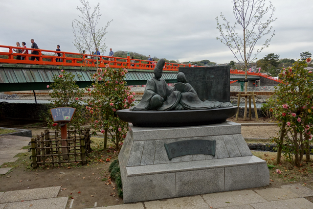 稍早於「宇治橋」頭看過「源式物語」作者「紫式部」石像,這兒則有另座被註示為「宇治十帖」的男女併坐作品,不知講述的是哪段情節。而從此處往房舍群望,便能覓見朱紅鳥居立於叉徑,標誌「宇治神社」的入口。然雖說牌碑這樣刻寫,神社主體卻不在此,得再踏著梯階往山上略微轉繞,才能見其本殿。