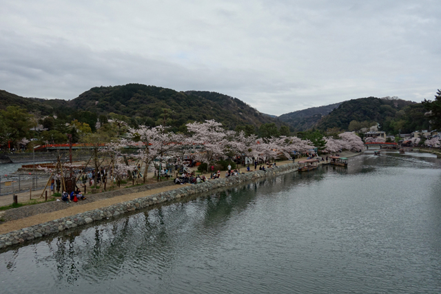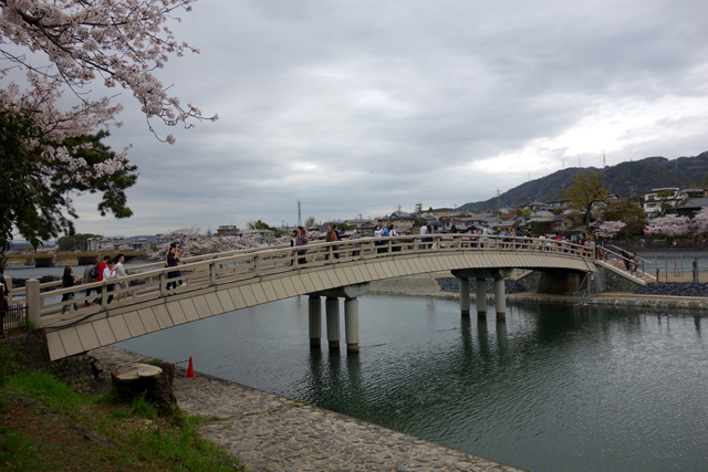 走出院門,我快步抄著支路來到「宇治川」邊,一如之前調查的,這附近的確也有便橋輾轉搭向對岸。表參道入口的「宇治橋」因聯通主要幹道而路幅寬闊,此橋則細窄微拱,輕輕巧巧將遊人接往河中長島。橋上望出的景致秀麗,畢竟兩岸堤防皆植滿櫻樹,儘管天色幽灰、水光稍闃,依舊以其繁密花姿連綴成粉艷長帶。