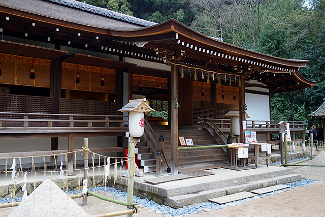 殿口的兩側各有一銀白砂錐,傳言是神祇臨降之處,若捐些錢,似也能在販賣處領少許砂礫作為護身之物。而再往右手邊繞,另有座屋閣遮蔭著「桐原水」,我好奇跟著幾個遊人入探,那裡面光線晦暗,隱有流泉之聲,幾個信眾舀了些許淨手,就不知是否真如傳語那樣,有著強身癒病功效。