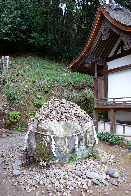 「本殿」的兩翼還配襯了幾座小神社作為護持,以屋簷的錯落風姿在密林前繪下秀美景致。除了「住吉社」和「香椎社」,另有棟標名為「春日神社」,或許與明日即將參訪的奈良「春日大社」同源。間處還有塊頂著碎礫的巨岩,用「注連繩」敬圍,想必也該是附存著某位山靈吧。