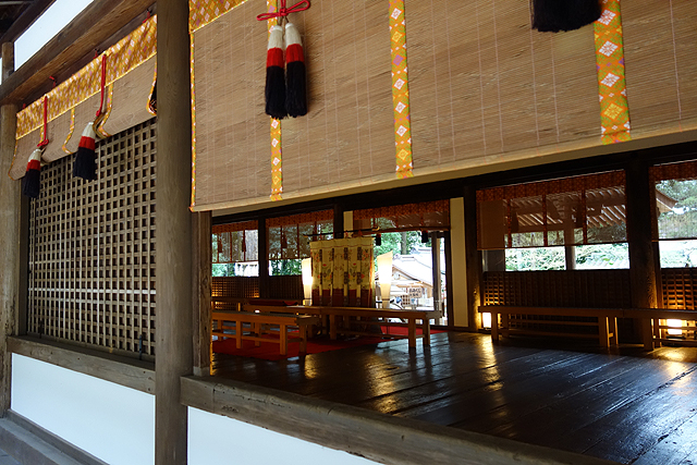 而當從後方的樸褐院門穿入,我總算趕在關閉的四點前達陣。先望見的是「拜殿」,它以橫展形貌盤踞在院心,隱去後方殿舍佈局。不僅如此,窗廊也用金紋編綴的竹簾掛掩,連門心亦張起繡花屏風阻隔任何好奇視線。我花了點時間在此佇望,端詳柱樑間的飾物、及其在隱抑中又略顯勾曲的簷線。據說它建於「鎌倉年代」,曾是離宮的一部分,難怪雖脫離了繁華之境,依舊持著揚飛威展之勢。