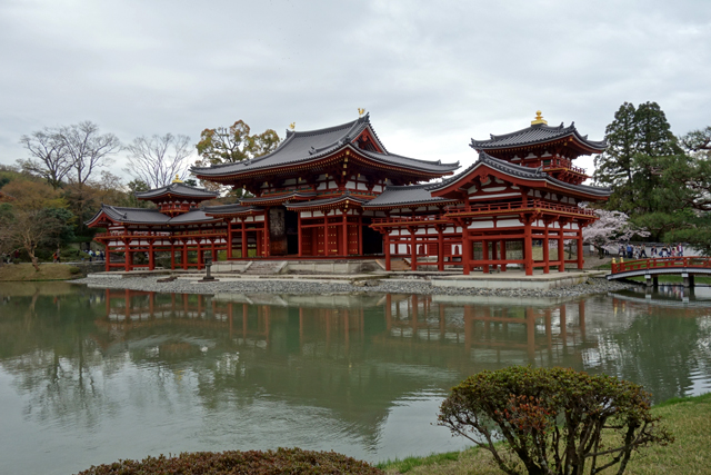 走至正面,這兒是諸多遊人定望的所在,畢竟日本十元硬幣便有其橫踞殿閣,萬元紙鈔也精繪了脊緣的金耀鳳凰,它們成對地昂立互望,展揚燦羽,宛如招攝了旭日光采。其實根據考據,「平等院」原本的規模更為闊偉,院前川邊也無堤防遮擋視線,因此,當薄曦乍現、朝霧尚未散退,從對處遠望,就形似一片極樂淨土,茫茫渺渺現於靜川之上。