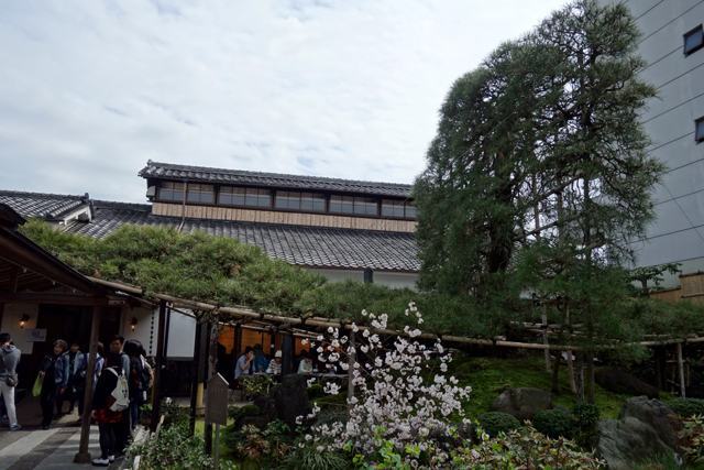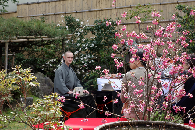 果不其然,店內人山人海,還能看到不少已等到呆滯的面容。不過院內挺有意思,在「金閣寺」曾看過「陸舟之松」,這裡也有松枝高豎如帆,再往旁貼依棚架橫探成船頭。妙的是還有位西洋五官的帥和尚,笑臉盈盈坐在花席間招待著茶,不知什麼路數。