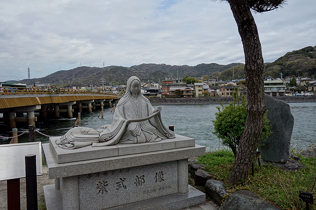 嚐含著冰淇淋走到「宇治川」,一道長橋筆直搭往河的對側,橋頭還有「源氏物語」作者「紫式部」的石雕像,然我的目的地「平等院」不在對岸,而是在近處的表參道末尾。由於遊客目標多半於此,所以這條街也成了一級戰區,樸褐町屋掛起古色古香招牌,以各自引以為傲的茶品挑勾人眾,不少店門口乾脆運作起大型煎焙機具,送漫豐厚茶香。這味道極度魅惑,輕輕柔柔從鼻搔弄入心,搞得我幾乎要暈迷了。