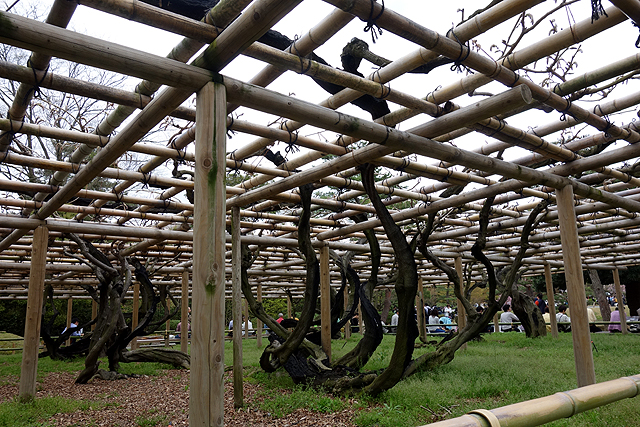 離此不遠處設了一區架高棚架,當中植樹枝幹扭折得詭譎,又無花無葉,很難讓人領略此景之意。然回國後讀了別人網誌,我才知它其實是紫藤花啊,假使走對了行訪季節,望見的將會是片浪漫紫簾隨風飄逸揚擺。只能說人心真的極易被視覺矇騙,以初見的第一印象否定一切。