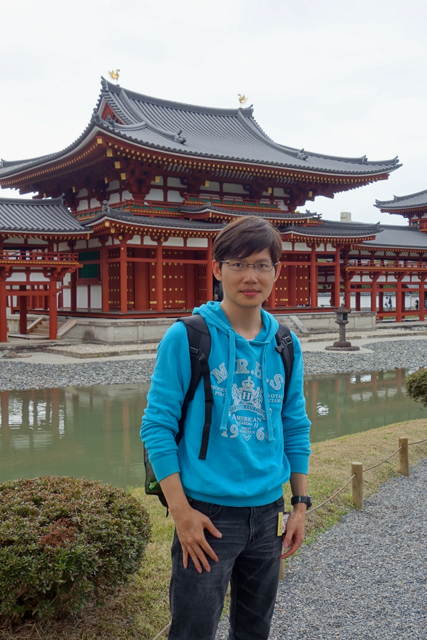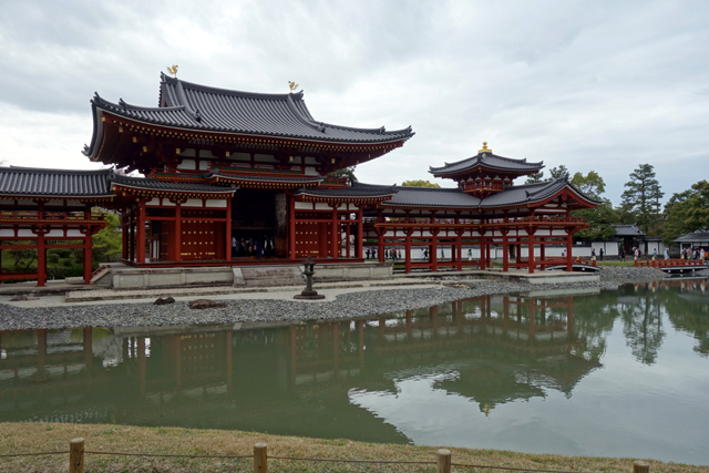 而當行過棚架,隨著諸多遊人的視線往前望去,我便看到「平等院」最經典的風景,池水中的「鳳凰堂」。時間倒推回千年前的「平安時代」,當時曾有公卿「藤原道長」權勢呼風喚雨,光是女兒便有三位陸續成了皇后,他在這兒建了名為「宇治殿」的別墅,但過世後卻被兒子「藤原賴通」改建為佛寺「平等院」。那是個淨土之說極為風行的年代,由於正值釋迦牟尼逝世兩千年,諸民憂慮末法降臨將帶來天災人禍、佛理離悖,於是諸侯們領頭寄情來世,眼前的殿閣佈局便是依著他們對極樂世界的揣想,幻美地構築而現。