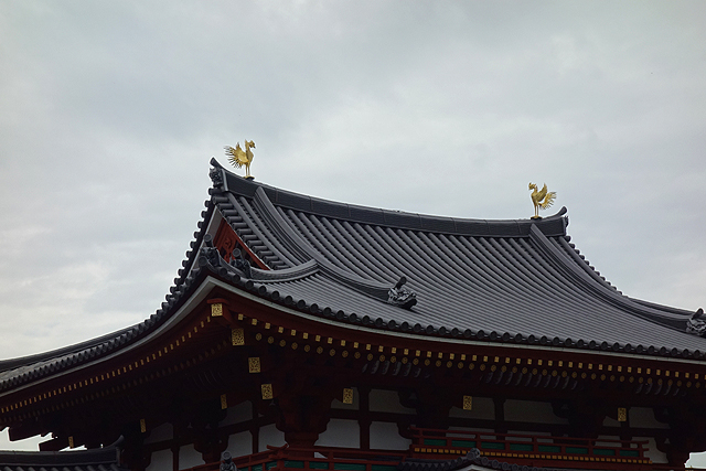 這座「鳳凰堂」端立於「阿字池」,原先我不太懂「阿」意指為何,但倒看到有人解說是梵語中包納宇宙萬物的不生不滅能量。或許真是如此,池中鏡影清晰,偶爾隨漣漪盪顫,堂殿便像從虛幻中浮透而生,華麗氣勢兼具。它以歇山簷線飛挑,並藉被稱為「裳階」的推擴設計,用疊簷、環廊豐富殿體層次。而後兩側長廊如翼張展,先沉降蓄勢,再於翼尾揚舞為角樓,勻稱中又豐沛著起伏能量。