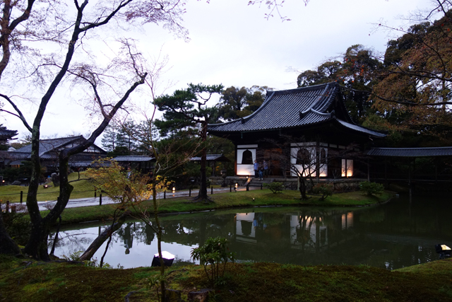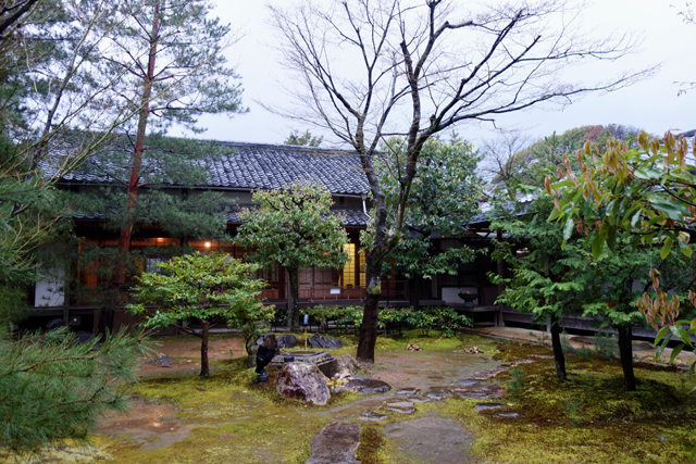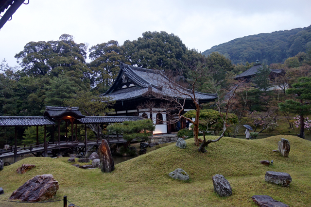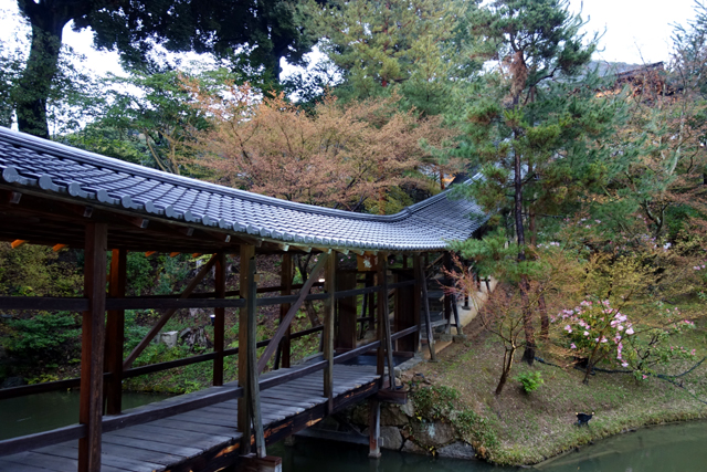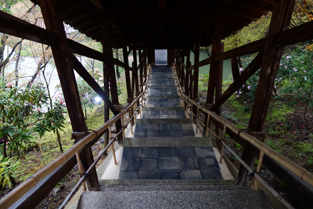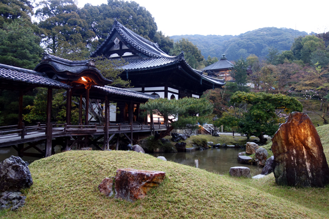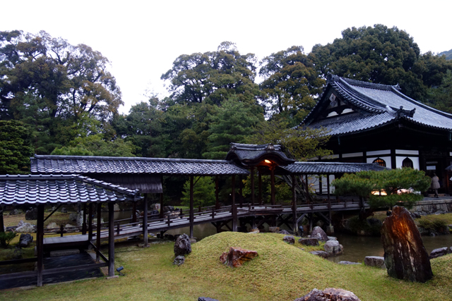 在感激中離開「方丈」後,我目光轉向隔鄰的「開山堂」。一轉方才的枯山水佈局,這兒以迴遊式泉池作設計,西側是「偃月池」,有名為「觀月台」的長廊由「書院」橫跨串接,東側則為相互呼應的「臥龍池」,以「臥龍廊」攀高斜抵對丘的「靈屋」。應是為了保存古物,長廊並未開放,故無法行至橋中望亭,感受扶欄望月的逸趣。不過由池岸倒能一覽屋廊形構的線條,望其由起伏岸石點水而躍,如長龍橫陳擺尾,淵渟嶽峙。