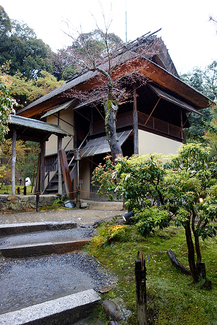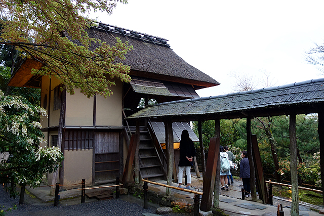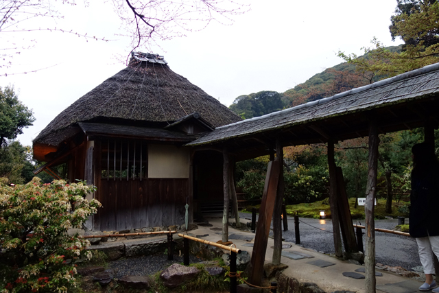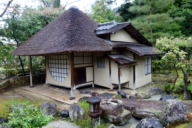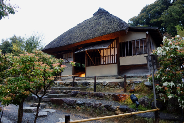 小徑領著我沿牆走至庭院最北再向東轉,右邊是被蒼樹點掩的長屋「湖月庵」,左側為略帶童趣的「遺芳庵」。小徑蜿蜒、溝壑曲折,後者這方矮茶室便像坐於溪畔的小童,滿月圓窗為笑顏、褐草斜簷為斗笠,在樹蔭下踢著水花,漾著鄉居幽情,頗討人喜歡。
