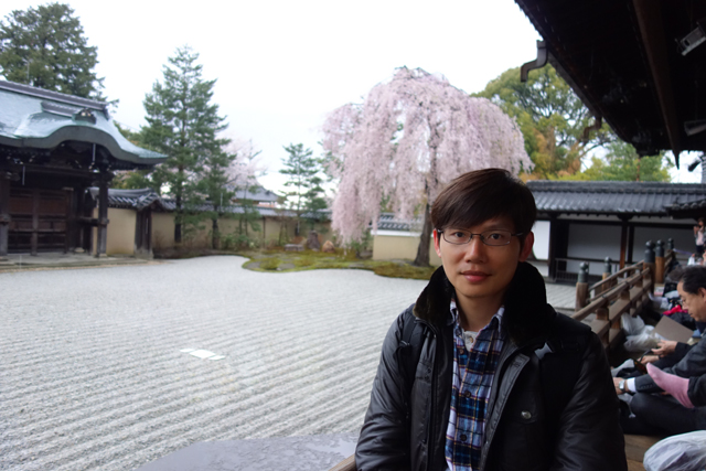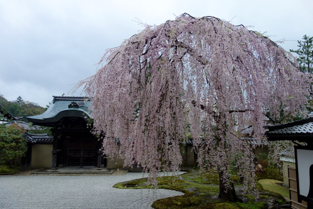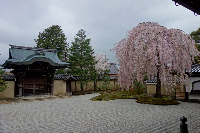 從「方丈」緣廊穿出,「高台寺」最主要的亮點「彼心庭」倏然展現,「敕使門」以唐破風勾出優雅線條,橫刷的銀亮砂紋曲繞成灘岸,依牆的苔原自有林樹綴點,但眾人目光卻不由自主駐於角落那株枝垂櫻。很慶幸到訪的正是時節,其披垂的纖枝上花串滿盛,將樹冠勾出拋弧般的豐潤形姿,偶爾微颸帶起枝尾嬌弱揚擺,更讓它顯得風情萬種,彷若翩身邐行的麗人,一回眸便讓人心醉神迷。