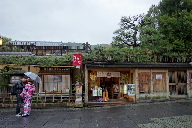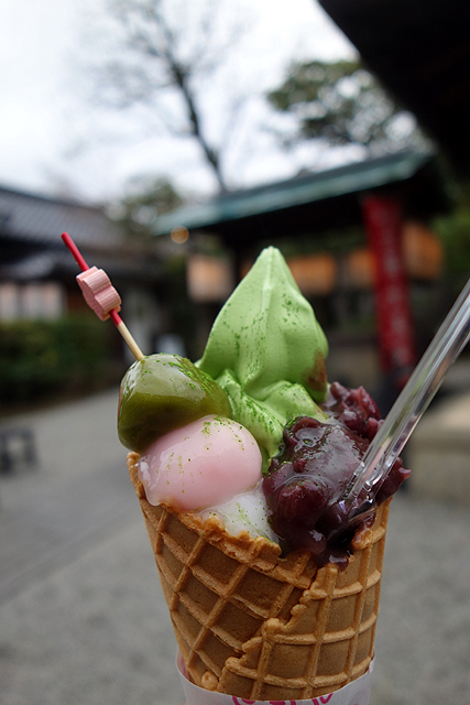 經過了「茶寮都路里」分店門口,忍不住又繞去探看,或許是被午間落雨驅趕,抑或「清水寺」遊客陸續散潮,一反我在剛開店時用餐的閒靜,這會兒連庭院都被排隊人眾擠得雜亂,頓時得意起我的抉擇正確。但人就是犯賤且禁不起誘惑,看到不耐久候的客人退了一步買了外帶抹茶霜淇淋,便也心癢難搔,畢竟我吃過的兩種聖代含的都是冰淇淋,口感上有著差異。於是就沒猶豫太久,以輕快腳步湊去,灑錢領了一根回來。