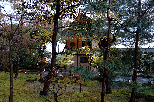 再續往東,視線隨池中的方閣寂影延展,順「臥龍廊」飛抵對丘,那兒簷瓦如龍鱗脊,昂躍至坡頂「靈屋」。此屋有長牆自隔為小院,廊柱間唐破風張立,斗栱以桃山式蒔繪點抹,顯得華貴。廳裡龕櫃亦用金漆勾出纖細擺葉、捲流祥雲,惹人定眼端詳。