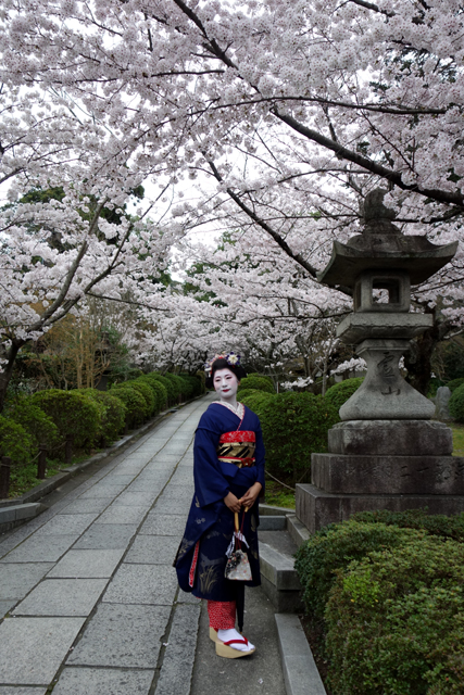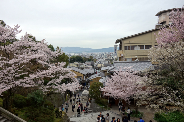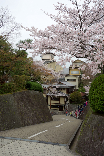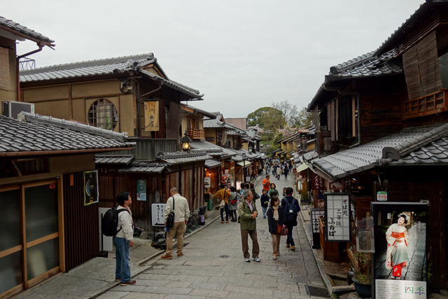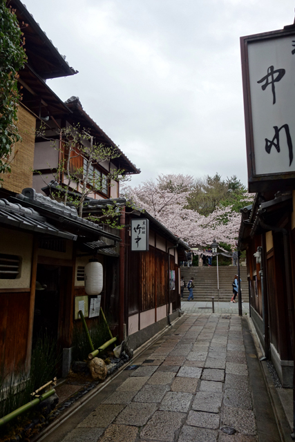 這條長階在過了「八坂通」岔路後成了「二年坂」,依同樣邏輯,應就是修築於「大同二年」吧,但為何又稱「二寧坂」?就沒看到什麼奇談幫它添增趣味了。不過「清水寺」都已遊人湧聚,此時還想復見晨初那靜謐的清幽街景,就是種奢望,石板路上觀光客來去走晃,連藝伎也停佇於石燈籠旁,任遊人留攝其花樹下身影。自然亦有旅遊團揮旗招嚷、勉力想聚起被沿路商品勾走的四散團員。然換個角度想,陸續推敞的店門、漸次擺出的攤桌、放眼所見的琳瑯商品,皆也是種歡快街景,勾著人踩動精神步伐一家一家探去。