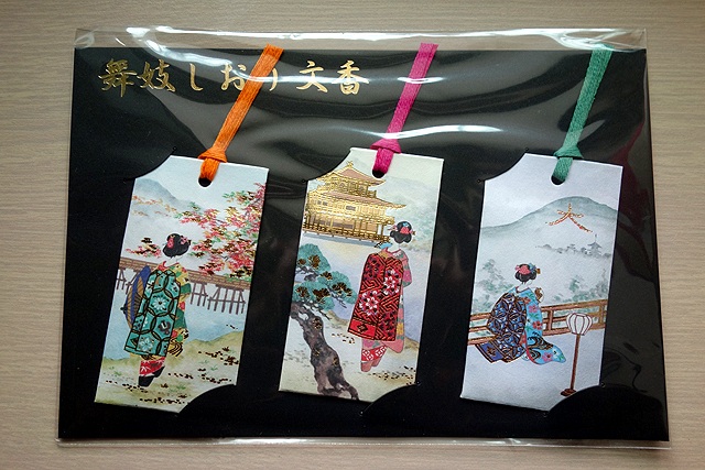可是這還未了,店裡另有許多和紙商品,以不同風雅色彩讓我進了迷境。結果最後是挑了以藝伎背影結合景點的文香,在朦朧淡彩中藝伎翩然行遊,留下點簇繁複紋花,很對我的喜好。但一出店才省覺,買了這些薰香類的能作啥?前幾日於「醍醐寺」已選了粽子模樣香包,還有因年老失憶、忘了是在哪個寺社購得的粉艷香包娃娃,難道要在夏夜高掛窗台、薰殺惱人蚊軍?