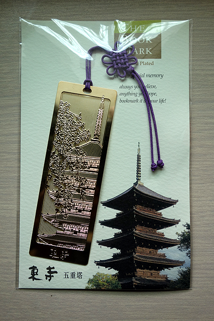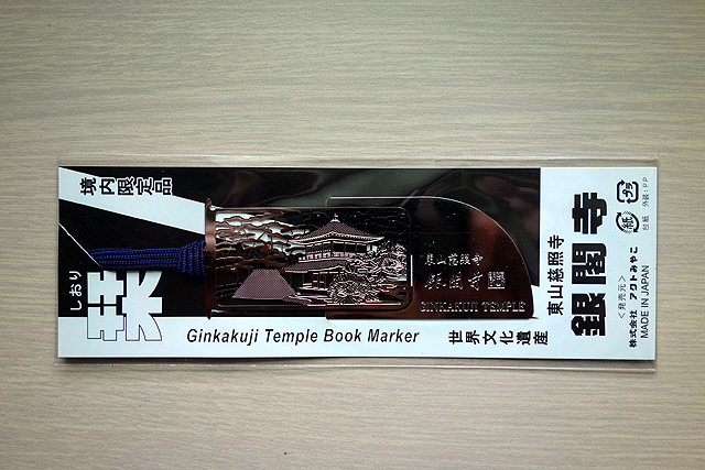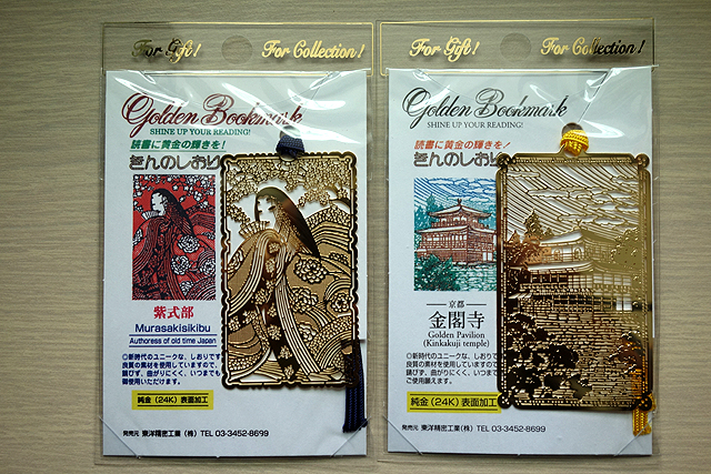 但雕鏤精微的書籤卻很難讓我移目,在「東寺」、「銀閣寺」已買了金銀各一枚,前者塔炫櫻華、後者閣輝砂耀,然見著一整掛板不同景點、不同主題的又讓我失心瘋了。費了好大的勸說功夫,才逼自己把手邊不由自主取下的放回一些,僅留了稱要與銀閣湊對的「金閣寺」,跟穿著花燦和服的「源氏物語」作者「紫式部」。