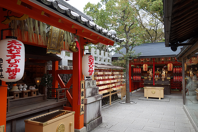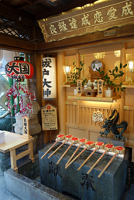 除了「大國主命」,一旁也散列許多小神社奉著我不太熟稔的各樣神祇,在艷燦撩目之外,不知為何還讓我感覺洋溢繽紛童趣。或許是壇案的福態雕像、參差羅列的木牌紙燈,抑或手水舍前水瓢背上渾圓書寫的良緣、開運字樣,行於其間,好像便自然朝氣蓬勃,對戀情充滿希望。