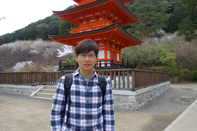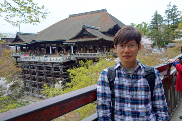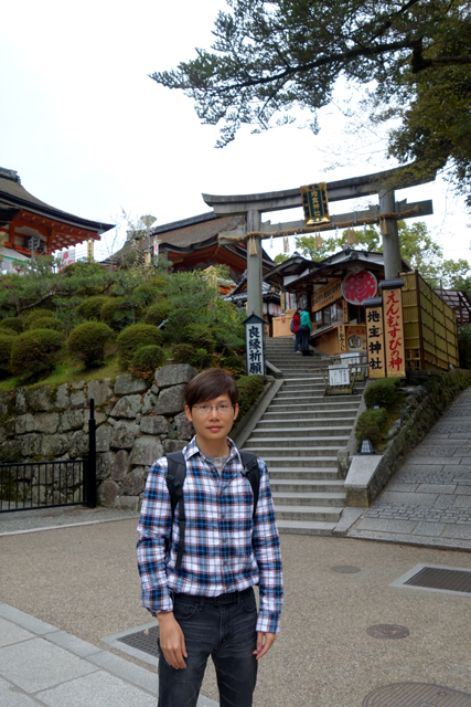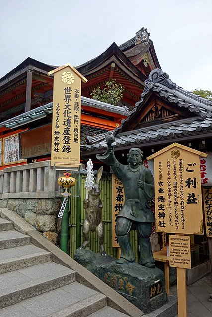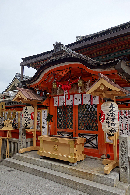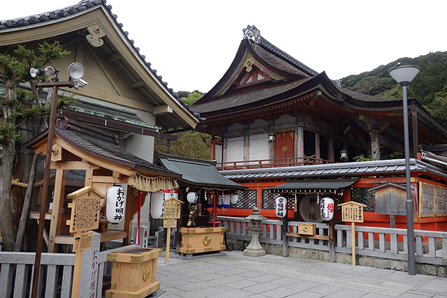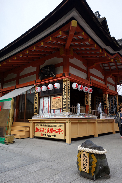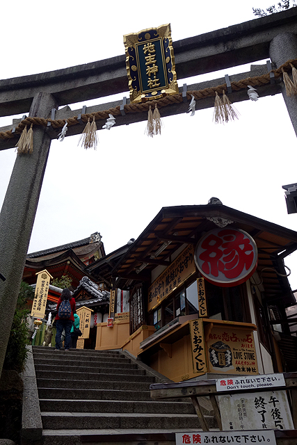 在日本,佛教與神道教雖是兩種不同信仰,卻因皆與民眾關係緊密而未劃分得涇渭分明,當信步行於寺廟,常能見著神社伴立。而在「清水寺」,才從舞台對側穿出「本堂」,果然又讓我看到鳥居於轉角揚展,柱旁標牌書寫著「地主神社」。