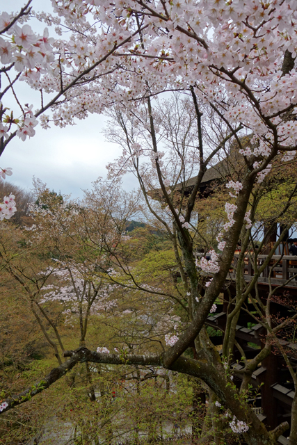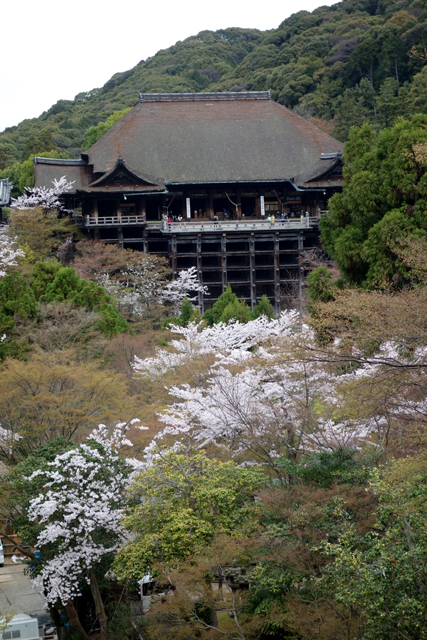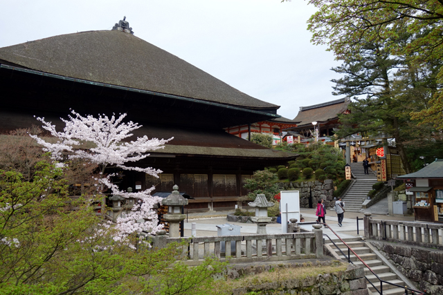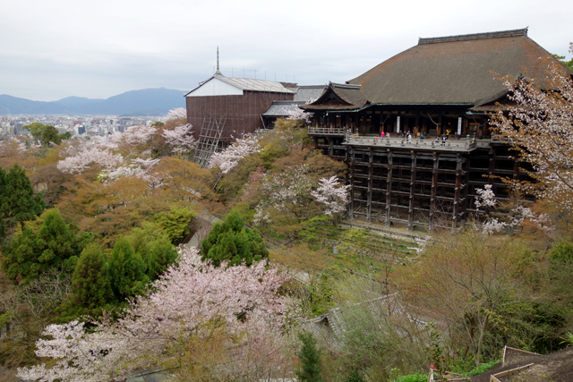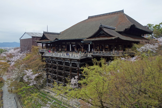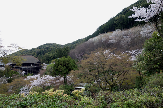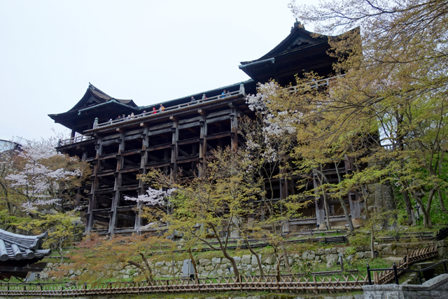 再順著崖道續行,「本堂」在櫻枝的掩映下忽隱忽現,最終在谷地對面現出以「清水舞台」探延的身側。方才於堂內感覺不甚明顯,但此刻望去,舞台以疊架支柱高懸在崖外,將原本已覺寬穩的簷殿縱拉至谷,更顯壯偉。同時兩側前探的千鳥破風簷口也起畫龍點睛之妙,加添了脊線的起伏,使其如重嶺浮透於碧葉粉櫻之間。