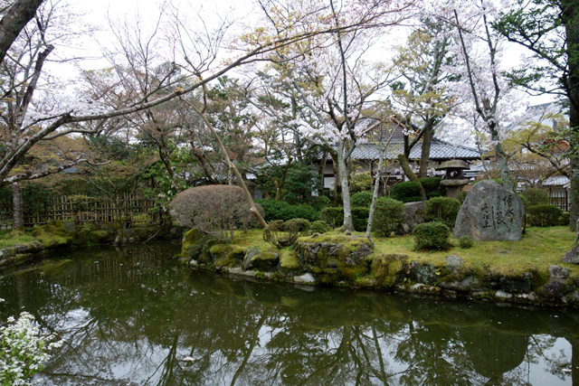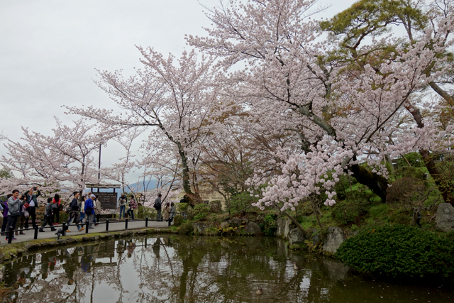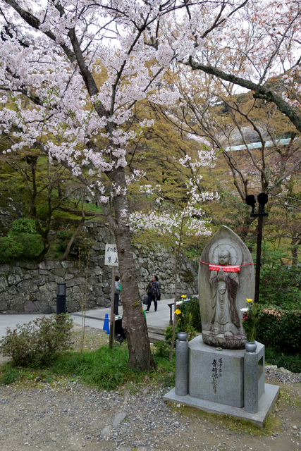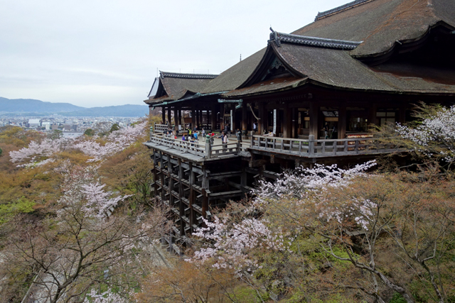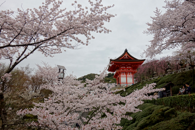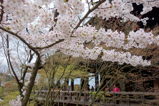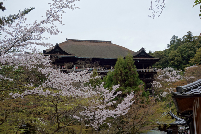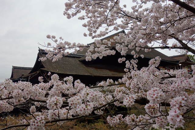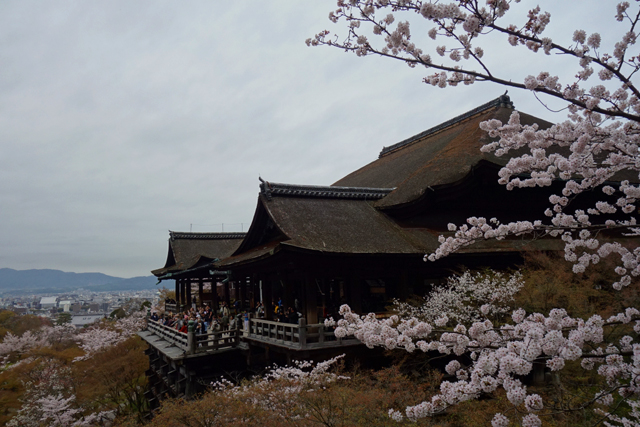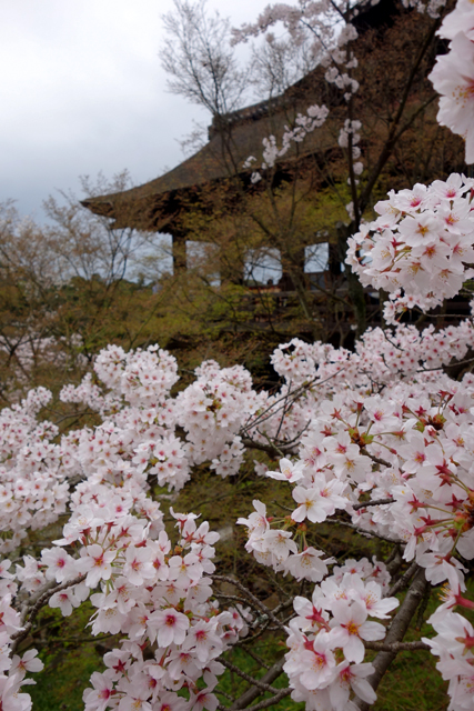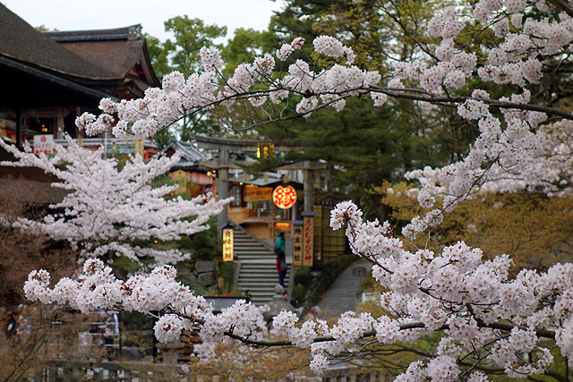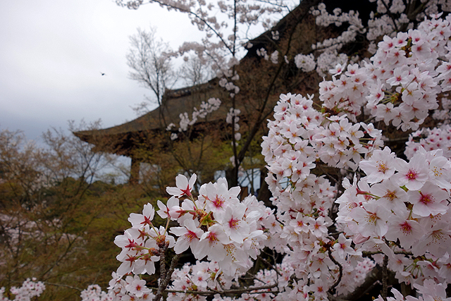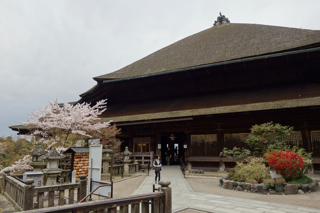 「清水寺」號稱四季皆有麗景,但亦因雜了以楓樹為大宗的其餘樹種,櫻花顯得略微疏散,沒有某些景點那樣集中狂放的懾人姿態。由「本堂」行出的小院算是花色較為明艷之處,它們依著環欄邊的石燈籠,以粉瓣綴抹廣簷。至於「本堂」,入寺的方向由於塔舍疊掩看不清晰,這兒反倒能細觀其貌。它屋簷呈微膨之形,與常見的凹弧飛挑線條迥異,搭襯上檜皮葺結構顯得豐厚,疊蓋在斑駁屋牆上有種挺過歷史風霜的穩重感。
