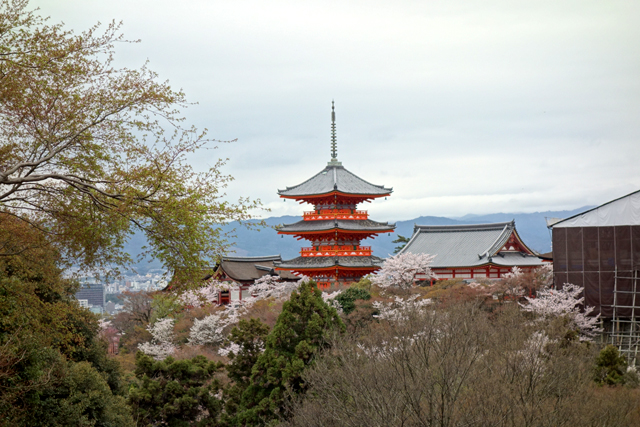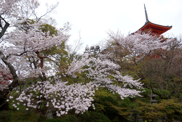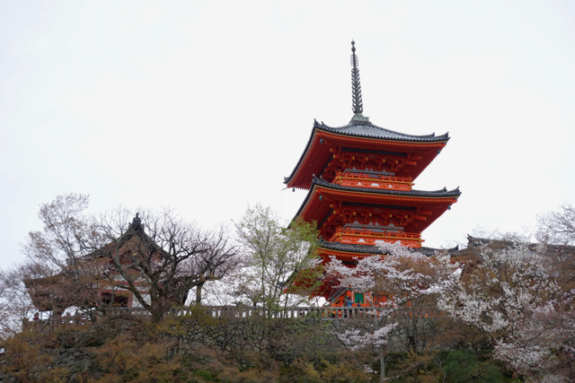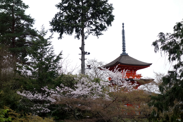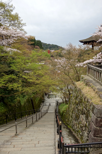 步道再往前便朝兩方向分歧,一邊轉往低谷,一邊指向「子安塔」。走在行抵後者的路徑上,總覺坡邊櫻樹都已進了斑落時期,不由得懷疑首日於車站看到的櫻花情報,它將花期估得遠,也迫我將「清水寺」的訪覽推延至今。但再想想,前幾天亦非空晃,於「醍醐寺」、於「哲學之道」都見著滿開盛景,就當是來「清水寺」感受其古遠禪意吧。