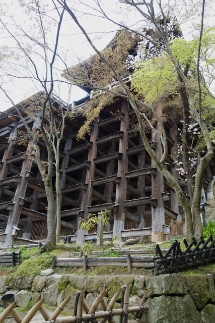 體驗過「音羽之瀧」,這會兒便真要從旁路出寺了,路從「清水舞台」底處經過,我不禁仰頭觀看這名為「懸造」的工法,方木整齊交疊為立體格柵,不帶任何花巧,也不需金屬釘栓,卻穩穩當當砌築起如此氣勢恢宏的殿台,挺過無數疾雨飛霜的時年,頗令人佩嘆。