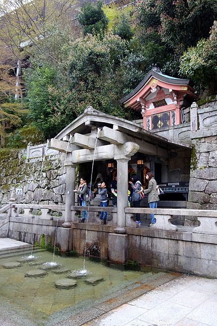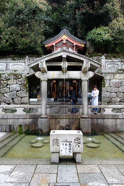 原路走返,在岔處選擇下行之徑,不旋踵,我來到寺內的另個必訪景點「音羽之瀧」。它有著小神社模樣,朱簷下又築了石簷前探,三道涓細水線便從簷口劃墜,落入階前水池,在靜謐晨寺泛起滌心擊聲。此寺既稱為「清水」,緣由的應就是這股銀澈之泉吧。