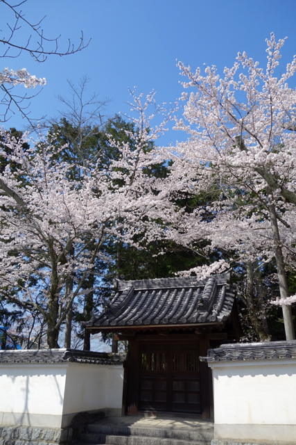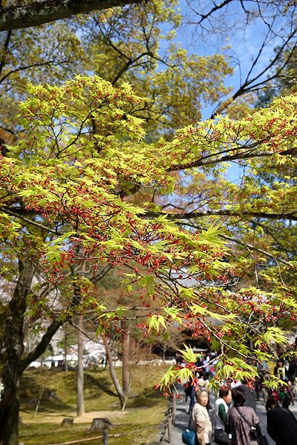 循寺院另端步徑行出時,自免不了抬望櫻朵,但令人詫異的還是尚為碧翠的楓樹枝頭。有幾株的星葉間漫點著艷紅,引人好奇近看,那是一顆顆垂墜的苞蕾,形如珠鈴,有些則已微綻細瓣,揚吐著花蕊,彷彿不欲讓繁櫻在這生機盎然的初春獨占鰲頭。我從未曾見過如此情景,著實長了見識。