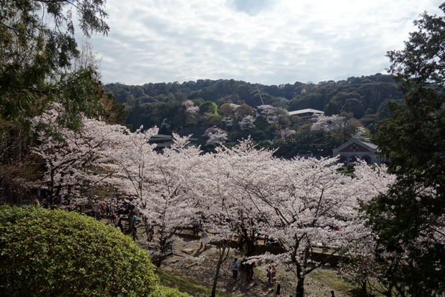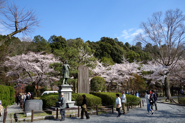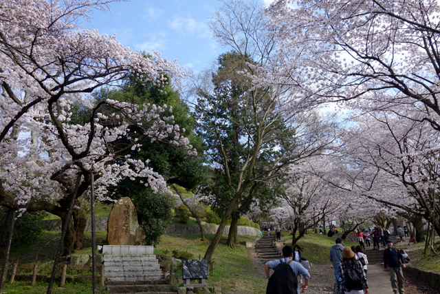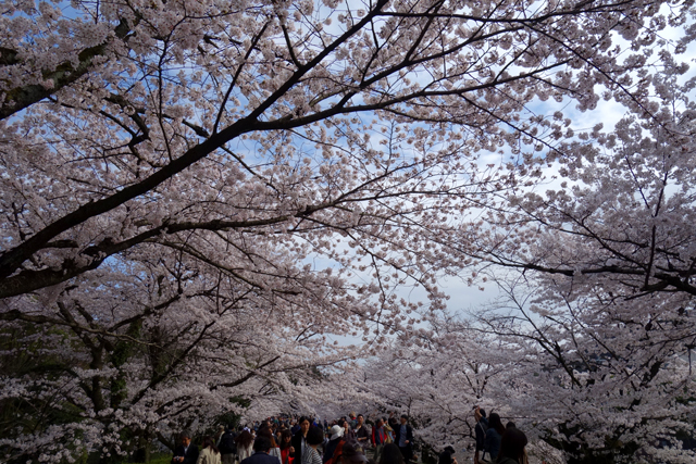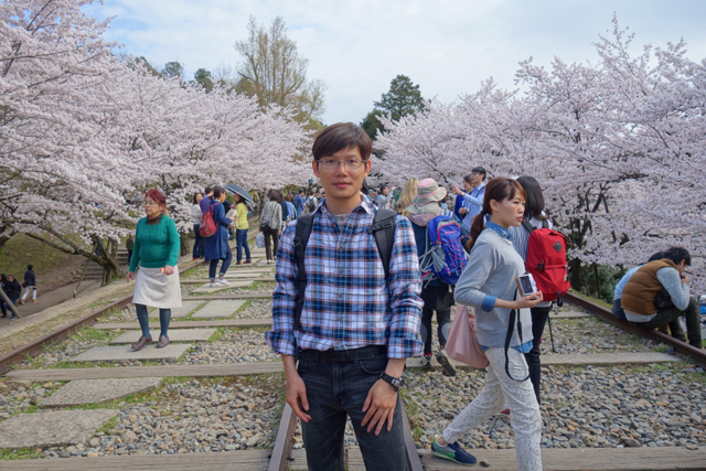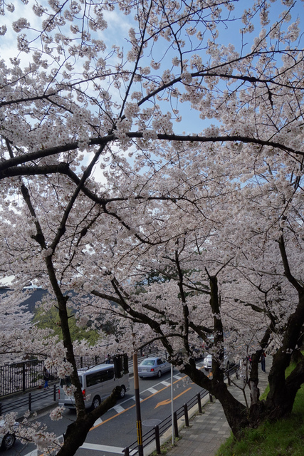 我興奮地踩著一旁徐緩坡道而上,花景果如傳言中的茂密,沒令我失望,然四周人眾雜沓,這擁聚的盛況似又比「哲學之道」那兒更為驚人。尤其是一路往遠處逸去的鐵道,簡直不見軌痕,幾乎要被遊人腿足淹沒。轉頭往上坡處望,路旁像是個衍生而出的小公園,想著反正待會得順鐵路往下走,便拿了主意,決定先將上段這區探個究竟。