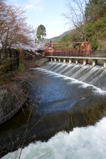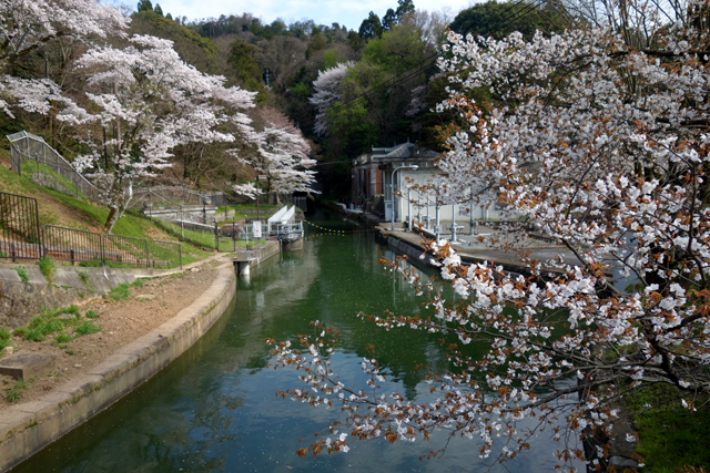 再往裡步去,大片鐵架機房伸探出赭紅圓粗管路,猜測該為附屬的那座水力發電廠。我循著旁側的鐵欄環徑走,也順道往下往遠處望,山巒之外自是京都市區的房閣星羅棋布,但眼下這鋼鐵構體卻因著粉櫻的襯綴,淡去其剛冷之色,呈現反差的逸趣。