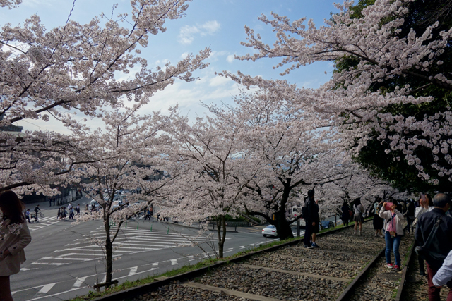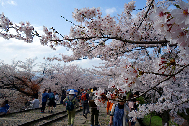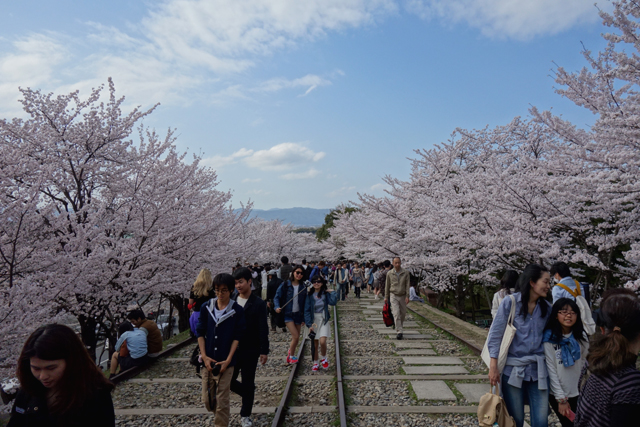 假使坡道只是山徑,那在櫻樹處處的京都便只能算是尋常,但當腳下之路為鐵道,踩著枕木、踢出細碎卵石沙沙聲,便自有另種特出情趣。不少人興起童稚之心如走平衡木般,搖搖晃晃行於單軌,偶爾晃墜便激起同伴促狹鬧語,那在頭頂微盪的櫻枝也像是跟著莞然顫笑,若風再疾些便要抖落額肩綴瓣。