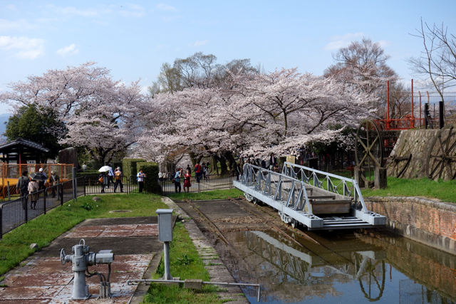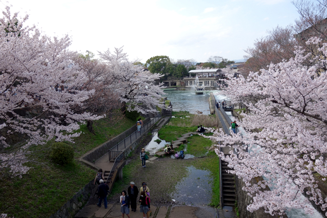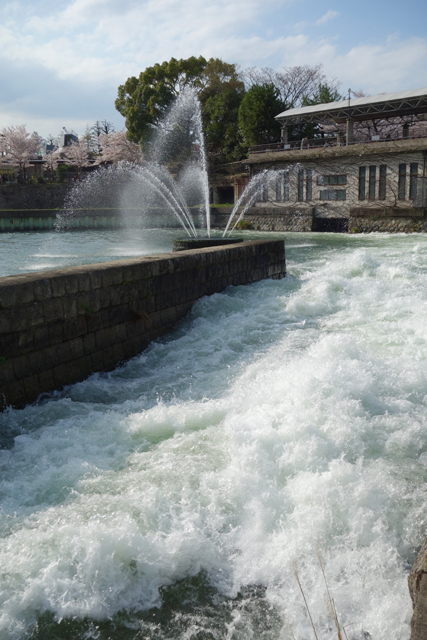 好奇走著石徑探入,原來內裡通抵至一棟建物,看標牌是「琵琶湖疏水紀念館」,而對岸櫻枝在環牆台棚外綴連,粉嫩地引人定目。查了地圖才發現那裡居然是動物園,但腳下這路倒像就止於此沒繼續接繞過去,搞得我似是被逗貓棒耍弄的貓兒,心癢難搔想一探究竟,卻被抓架原地,無法觸抵。能作的僅是怔望著湖中噴吐水泉,看水線散墜與群櫻交融一起。