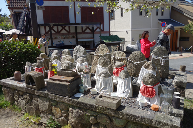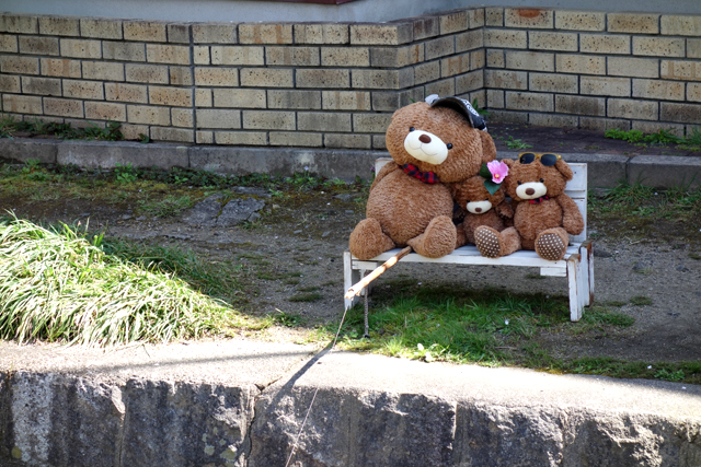 這樣的畫面自然形構出浪漫氛圍,有情人併肩含笑絮語,有新郎新娘擺著姿態讓繁櫻綴點衫裙,連長凳都被民家置上毛茸茸的棕熊娃娃。它們戴著小帽、別上花飾與太陽眼鏡,像持竿閒釣的一家人,彎勾嘴角,交互倚身,享受天倫和樂。再往前行,岩台上的守護石群同樣被繫上圍裙,如攜手出遊的稚童般,與巷口轉角的地藏娃娃們立望滿空春色。