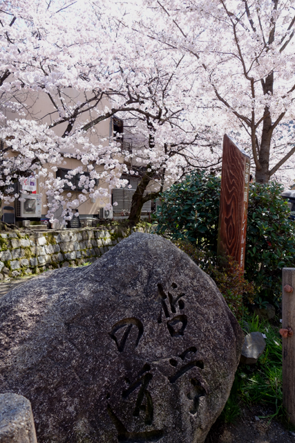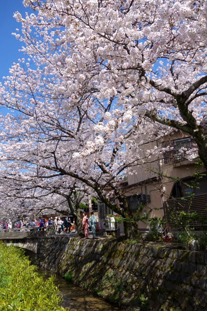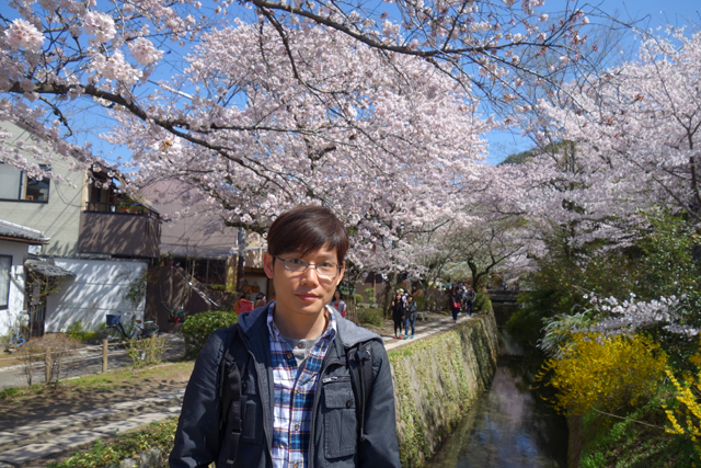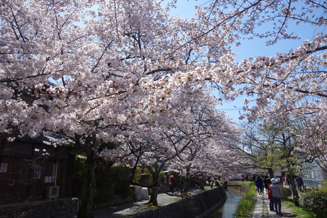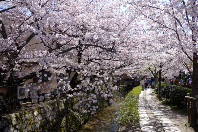 繞著曲池,看著「銀閣」身背於枝林間掩映,我行出了寺門。然一走至「哲學之道」,前方景象頓時令我傻了眼。或許是雨期中莫名拾得的晴日,抑或此處滿開情報一傳十十傳百,川溪畔、步道上、花樹旁,雜錯的遊人抬望。這瞬間我懷念起清晨的無人寧幽,看來是我過於天真,以為走逛「銀閣寺」後還能徜徉於靜寂櫻景,低估了賞花人眾的戰鬥力。