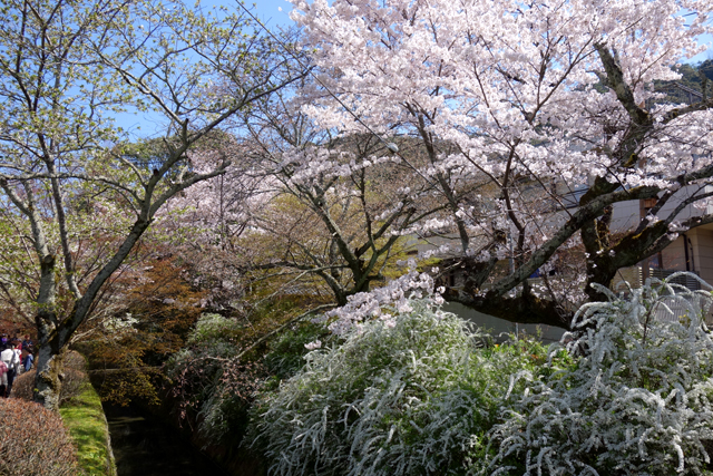 但像我這樣的庸碌世人,若真要於櫻下悟出什麼深奧哲理,恐也得來回至鞋禿足殘,才能略見乍現曙光。然美景最直接的感染與震撼,對任何人都是不分軒輊的,晴日艷朗,滿空的櫻朵卻密集地掩去烈照,僅篩下和煦微暖伴著徐風與我同遊。矮灌木切開街道,留了小徑貼近溪畔,綴著櫻朵的枝影在石板與川水烙下輕擺斑影。川水清淺,歡快地鑽溜過一座座短橋,當倚立橋心,橫探渡河的傾身櫻枝是令人定步的風景,彷彿為優雅的遞掌請邀,等我搭手後一同翩然隨川舞去。